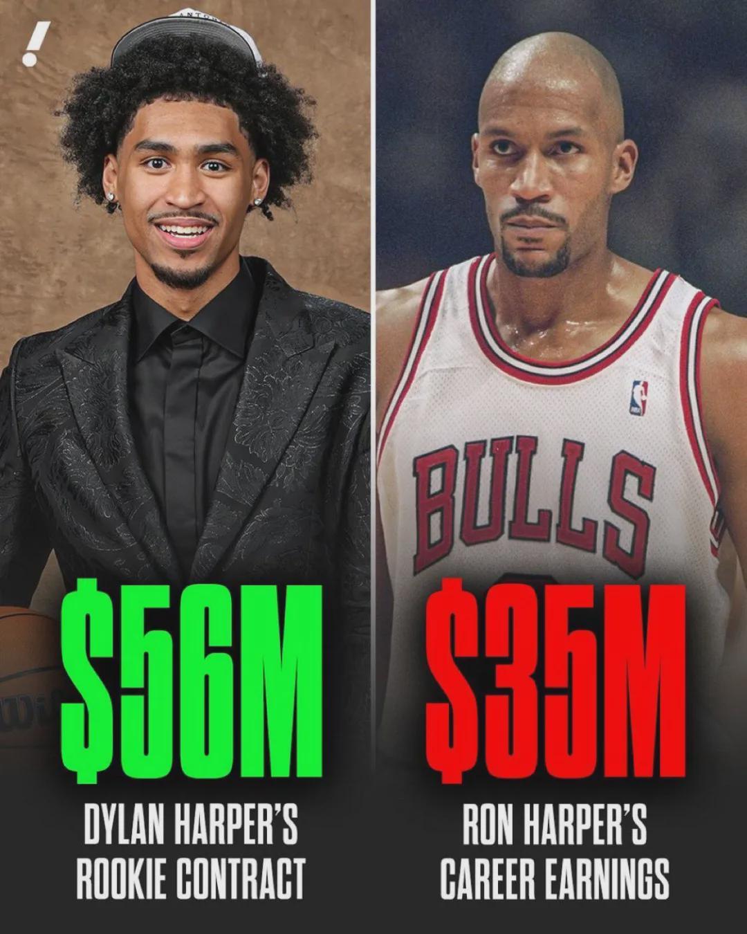 迪伦-哈珀的新秀合同是4年5600万美元,他的父亲罗恩-哈珀在NBA打了15年,生涯总薪水只不过3500万美元。老球迷对罗恩-哈珀不会陌生,公牛后三连冠时期的主力控卫,之后又跟随OK组合拿了两个冠军,2001年夏天退役。